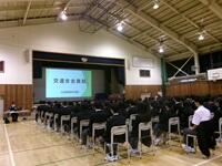 最初に、校長先生より挨拶と講師の紹介があり、講師に自転車の乗り方のルールについて等講演いただいた後、最後に風紀委員長が交通安全宣言を行いました。